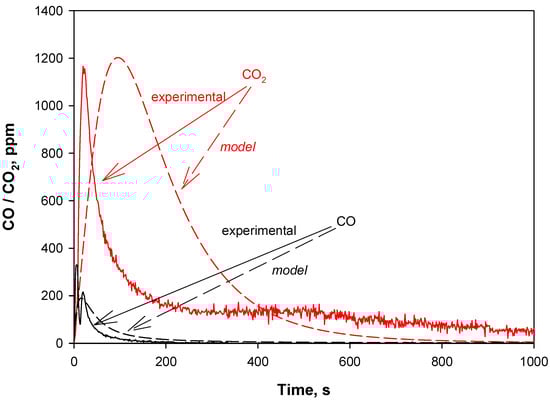 According to our trap experiment (Figure 3), the adsorption step is stopped at about 45 s (CO ≈ 100 ppm). To quantify the kinetic parameters of the oxidation reactions of the mechanism (steps 6 and 7), we fitted the experimental curves.