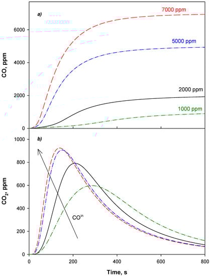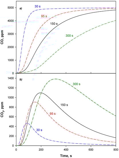 To this end, we simulated the complete (isothermal) trap, by setting COin = 5000 ppm and τ1 = 95 s. In Figure 13, CO2 (a and CO (b), are shown as a function of time as obtained by simulating both the adsorption (Phase I) and the oxidation (Phase II) step.
