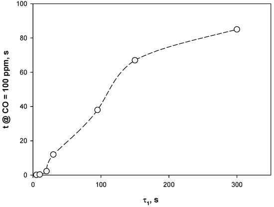 From our previous study [], we found that CO adsorption can be carried out at a temperature sufficiently lower than that activating H2 oxidation (55–85 °C), flowing the CO-containing mixture up to a time ensuring an exit CO concentration lower than 100 ppm. We also showed that the presence of H2 has a null or even positive effect on CO adsorption/CO2 formation, depending on the temperature, generating new hydroxyl groups at T > 80 °C, which enhances CO oxidation and adsorption over the catalyst surface.