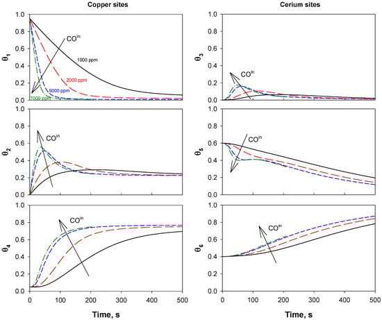 It is found that at the end of the reaction, Cu sites in the oxidized form are completely consumed (θ1 = 0). Parts of them are covered by CO (θ2) and parts of them are simply reduced (θ4).