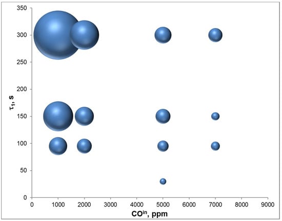 In Figure 12, results of simulations of the adsorption phase, varying both residence time and CO inlet concentration, are summarized by the plane residence time/CO inlet concentration. The bubble dimension is proportional to the time at which CO outlet concentration is equal to 100 ppm.