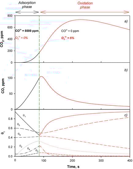 The corresponding evolution of the catalyst sites is shown in Figure 14 (c and d) as well. During the adsorption phase, we observe that the active sites (sites Cu2+--O2−-Ce4+) start to be covered by CO (θ1 decreases, θ2 increases). The activation of oxygen transfer from the Ce sites to the Cu sites (step 4 of the reaction mechanism) should also be noted, since θ6 slightly increases and θ5 decreases. CO is present as adsorbed over the catalyst (θ2) and only partially oxidized to CO2 (θ3).