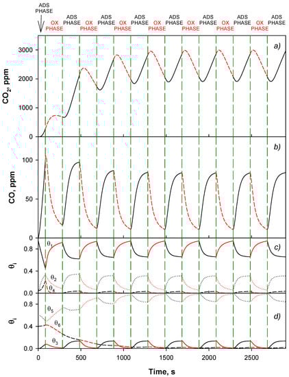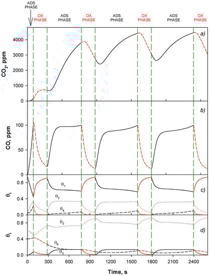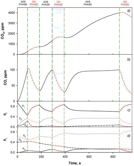 In order to improve the catalyst regeneration, we changed the time length of the oxidation phase. In Figure 15, the trap simulation results are shown in terms of CO and CO2 concentrations and site distribution as calculated by assuming a double oxidation phase duration (200 s), stopping the adsorption phase when CO concentration reaches 100 ppm as before. Under these conditions, CO adsorption can last more than the oxidation phase starting from the second cycle. This is due to a deeper re-oxidation of the copper sites (Figure 15d) and to the decrease of θ4 going down to zero at the end of each oxidation phase. As a consequence, the CO adsorbed/reacted and the CO2 formed can be the same at each cycle.