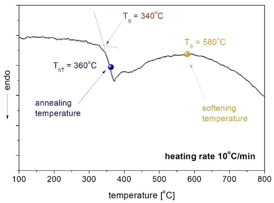 Transformation temperature at 340 °C was estimated through the two lines intersection method. The lack of any exothermal peaks confirms that fabricated glass is characterized by high thermal stability. Moreover, the two temperatures, 360 °C for annealing and 580 °C for the softening process, were also marked on the analyzed curve.