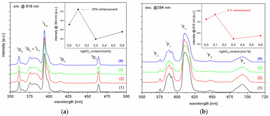 In order to determine the effect of silver ion concentration on the spectroscopic properties of fabricated glasses, the shape of excitation and emission bands were analyzed. Figure 2a shows the excitation spectra of europium ions in the SGB glasses as a function of Ag+ ions content. The spectra monitored at the wavelength of 616 nm (5D0→7F2 transition) have shown a range from 350 nm to 500 nm; two main intense bands centered at the wavelengths of 395 nm and 464 nm originated form 7F0→5L6 and 7F0→5D2 transitions respectively. Analysis of the intensity level of 7F0→5D2 transitions, in comparison to an un-doped sample, showed that a 20 % enhancement was obtained in glass doped with 0.1 mol.% AgNO3. This phenomenon can be explained by the local field effect of Ag0 nanoparticles created by partial thermo-reduction of silver ions [27,28]. Further increases of the Ag content leads to the quenching of the excitation band (inset Figure 2a). In all samples, a band at 395 nm is characterized by an intense transition in the UV-VIS spectral range; hence, it is suitable for the effective excitation of the Eu3+ ions by laser radiation at 394 nm.