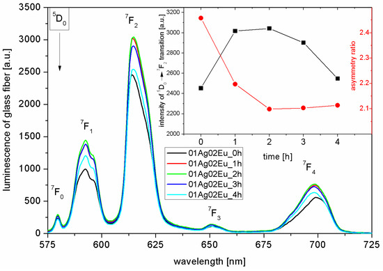 Analogously, we carried out the investigation of luminescent properties SGB_01Ag02Eu glass fiber under 394 nm laser excitation. The luminescence spectra of SGB_01Ag02Eu glass fiber are presented in Figure 4. It is worth noting that the obtained results for fiber are in good accordance with glass; hence, developed glass is characterized by high thermal stability and presents no structural changes during fiber drawing. In order to confirm our results, we used europium ions as a spectral probe. It is known that, among the 5D0→7FJ transitions, the emission line at 594 nm (5D0→7F1) is a magnetic dipole transition (MD), while the emission line at 616 nm (5D0→7F2) is an electric dipole transition (ED). The integrated intensity ratio of (5D0→7F2)/(5D0→7F1) transition gives a factor of the asymmetry of the local environment of the Eu ions. This value is less than 1.0 for symmetric, and is higher than 1.0 for non-centrosymmetric, surroundings [36]. In our experiment, the asymmetry ratio of SGB_01Ag02Eu glass is around 2.1 and is almost independent of annealing time (Table 1). In the case of the SGB_01Ag02Eu glass fiber used as reference sample, the asymmetry ratio is higher (R = 2.45). Thus, the drawing process leads to a slight structural distortion of glass lattice geometry around the Eu3+ ions. After the annealing process, the R ratio slightly reduces and is close to the value obtained in glass samples.