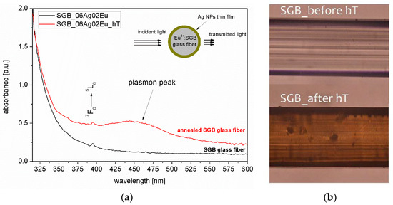 Absorbance spectra of SGB_06Ag02Eu glass fibers (a) measured through the side surface for parent fiber (black line) and heat-treated fiber at 360 °C for 1 h (red line) (inset—simplified scheme of transmission measurement). (b) Microscopic images of fabricated glass fibers (up) before and (down) after annealing process.