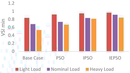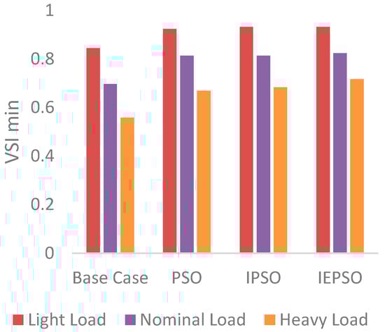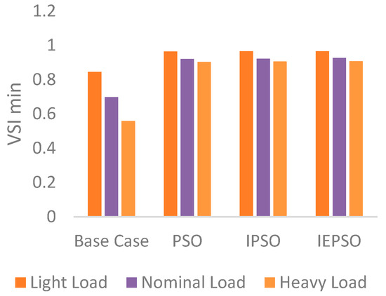 Table 7, the IEPSO technique gives the best optimal solution with the lowest power losses, improved VSI and computational time as indicated in bold for all load conditions. The increased in load levels, gave results in increasing power losses and decreasing VSI.