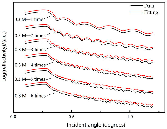 In our experiment, we spun the 0.3 M zirconia precursor on glass substrates one, two, three, four, five and six times. It was found that the thickness of ZrO2 films increased almost linearly with increasing spin-coating times. Figure 1 is the XRR fitting results of the ZrO2 films with varying thicknesses. From the fitting results, the thickness of the single-spin-coating film was about 22 nm, and a 130 nm ZrO2 film can be obtained by six-times spin-coating. Obviously, a thicker film would render a smaller leakage current density. Also, the 0.6 M ZrO2 precursor was swirled for one, two and three times. The thickness of the ZrO2 film obtained by using the 0.6 M precursor is about two-fold thicker than that of the ZrO2 film obtained by using 0.3 M precursor. Additional details are listed in Table 1.