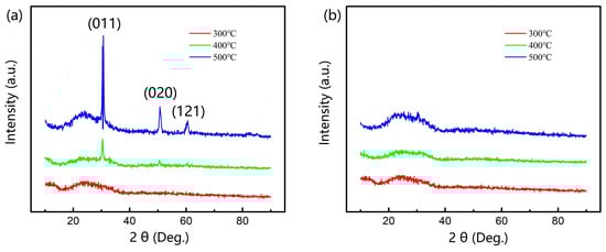 XRD spectra of ZrO2 films with different post-annealing temperatures. ZrO2 film of (a) 67 nm and (b) 130 nm.