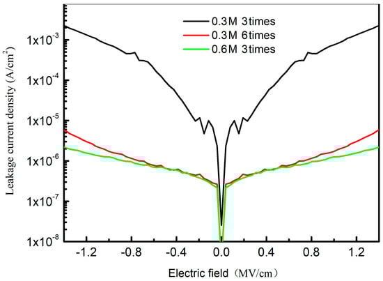 To increase the thickness of ZrO2 film, increasing the concentration of precursor or spin-coating times is an effective method. From the XRR fitting results, the ZrO2 films obtained by spin-coating 0.6 M precursor for three times, and 0.3 M precursor for three and six times, show a corresponding thickness of 132 nm, 67 nm and 130 nm, respectively. Figure 3 shows the leakage current density of the above ZrO2 films. The ZrO2 film with 67 nm thickness demonstrated the largest leakage current density. For ZrO2 films with 132 nm and 130 nm thicknesses, they exhibited comparable leakage current density despite the difference in the precursor concentration and times. A thick ZrO2 film may inhibit the crystallization of the film that led to the reduction in leakage current density.