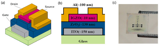 (a) Schematic showing the cross-section of IGZO-TFT with ZrO2 dielectric layer. (b) Thickness of each layer. (c) Photograph of the fabricated TFT.