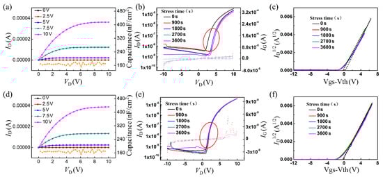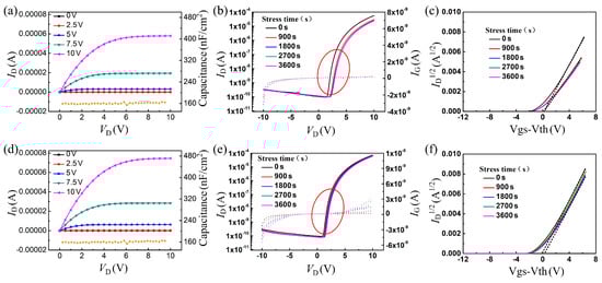 Bias stability of the TFT with ZrO2 film fabricated by 0.6 M precursor spin-coating 3 times. (a) Output curves and gate capacitance as a function of voltage. (b) Transfer curves with gate-leakage current curves of positive bias stress. (c) Plots of sqrt Ids (drain/source current) versus gate overdrive of positive bias stress. (d) Output curves and gate capacitance as a function of voltage. (e) Transfer curves with gate-leakage current curves of negative bias stress. (f) Plots of sqrt Ids (drain/source current) versus gate overdrive of negative bias stress.