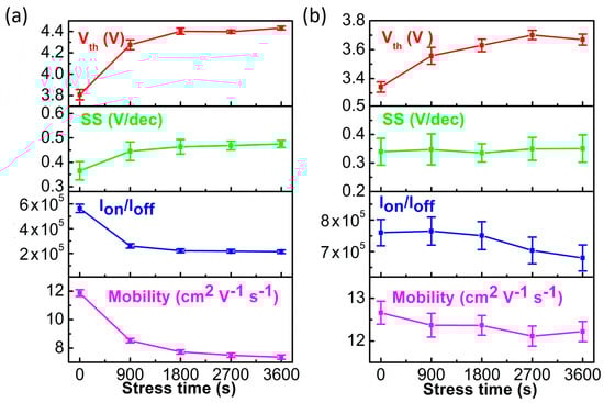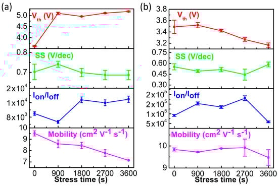 The trend of electrical characteristics of the TFT with ZrO2 film fabricated by 0.3 M precursor spin-coating 6 times. (a) Positive bias stress. (b) Negative bias stress.