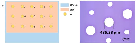 The leakage current densities (shown in Figure 3) of ZrO2 films obtained by spin-coating with 0.6 M and 0.3 M precursor for three and six times, respectively, were quite similar. However, the bias stability of the TFTs based on them were greatly different. Figure 9 shows the top view and polarizing graphs of the MIM structure. In order to compare the electrical homogeneity of the insulating films mentioned above, we select nine feature points on the insulating film to measure the leakage current density, as shown in Figure 9. Figure 10 shows the leakage current density of each feature point. Table 3 shows the statistics of electrical properties of each feature point. It can be seen that the ZrO2 film achieved by spin-coating with 0.3 M precursor for six times had better electrical uniformity.