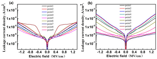 The leakage current density of each feature point on the ZrO2 film. (a) 0.3 M precursor spin-coating 6 times. (b) 0.6 M precursor spin-coating 3 times.