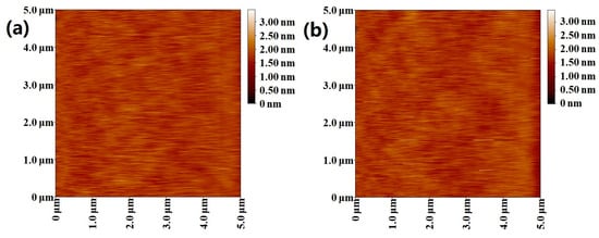 Figure 11 is the AFM diagram of ZrO2 films fabricated by spin-coating with 0.6 M precursor for three times and 0.3 M precursor for six times. Both of them had low roughness, and the root mean square of ZrO2 films in devices A and B were 0.16 nm and 0.18 nm, respectively. After the precursor was spin-coated, a wet film was formed containing a large number of ions. The high-concentration precursor (0.6 M) might lead to high surface roughness due to the irregular arrangement of atoms during the annealing process, during which Zr and O elements moved and recombined to form Zr–O bonding. From the results above, the ZrO2 films in device A showed smoother surface, lower leakage current density and better electrical uniformity. A smooth surface morphology may result in the alleviation of electron trapping at the channel–insulator interface, which is a great contribution to improve the electrical properties and bias stability of TFTs [28,29,30].