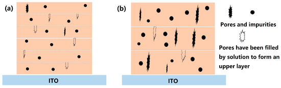 Cross-sectional schematic diagrams of ZrO2 films. (a) 0.3 M precursor spin-coating 6 times. (b) 0.6 M precursor spin-coating 3 times. The interfacial pores and pinholes in the sublayer filled by solution to form an upper layer.