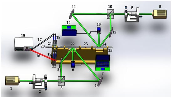 Principle of a Kolsky bar based on in-plane measurement; 1 and 8 are lasers; 2 and 9 are spatial filters; 3 and 10 are beam splitters; 4, 5, 11, and 12 are reflectors; 6 and 13 are detectors; 7 and 14 are computers; 15 is an oscilloscope; 16 and 17 are optical fibers; 18 and 19 are fiber detectors; 20 is the striker bar; 21 is the guide; 22 is the incident bar; 23 is the specimen; 24 is the transmitter bar; 25 is the support frame.