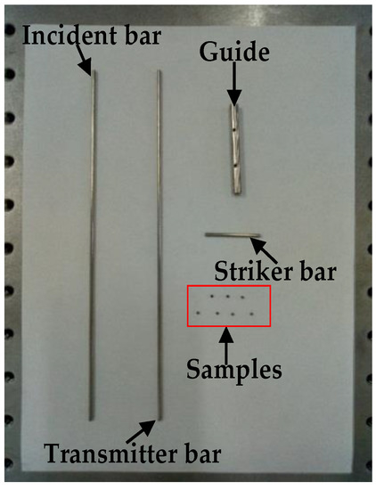 The Kolsky bar based on in-plane displacement measurement is mainly intended to provide a new test method for the dynamic mechanical properties of small-size material samples. Therefore, the Kolsky bar is only 2 mm in diameter in the measurement system. A physical map of the guide, striker bar, incident bar, transmitter bar, and the sample is shown in Figure 5, and their sizes are shown in Table 1.
