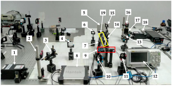 Dynamic mechanical properties of materials experimental setup: 1 and 18 are green lasers; 2 and 16 are beam lifters; 3 and 17 are spatial filters; 4 and 13 are beam splitters; 5 is a baffle; 6, 10, 11 and 15 are reflectors; 7 and 14 are point detectors; 8 is a virtual oscilloscope; 9 is the trigger device; 12 is an oscilloscope; 19 is the SHPB device.