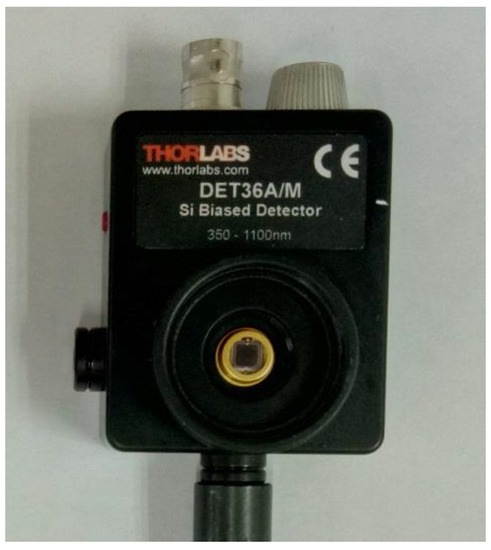 The specimen described here is made of 304 L stainless steel, with diameter and thickness of 1.5 mm and 0.75 mm, respectively. The sample is held between the incident bar and the transmitter bar with butter. The pole longitudinal wave velocity in the bar is 4934 m/s. In order to improve the detection of changes in light intensity, here, we use a high-speed photodetector as the detector device. The high-speed photodetector is Thorlabs’ Biased Photo-detectors (DET36A/M, Thorlabs, NJ, USA), a Si biased detector covering the 350 nm to 1100 nm wavelength range and rise times as fast as 1 ns, as shown in Figure 13. A virtual oscilloscope (DSO3062AL) produced by Hantek Company (Hantek, Qindao, China) was used to collect data.
