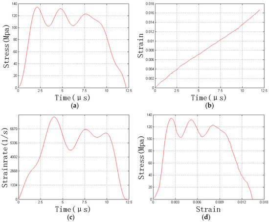 Dynamic mechanical properties of the specimen: (a) stress curve; (b) strain curve; (c) strain rate curve; (d) stress–strain curve.
