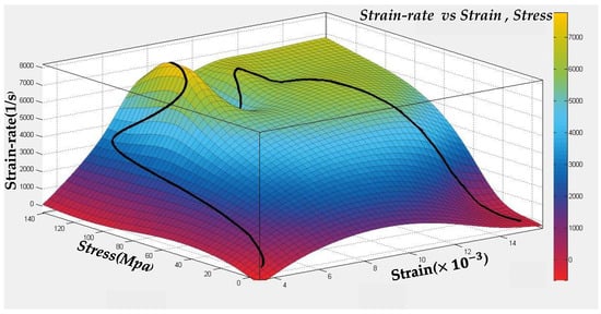 Figure 15 shows that the maximum stress applied to the specimen during the experiment was 134.21 Mpa. As the stress increased from 0 to 134.21, the maximum strain of the specimen was 0.0166, indicating that the specimen is still in the elastic phase. The strain-rate increased from 0 to 7787(1/s). Figure 16 shows the three-dimensional surface map of stress, strain, and strain rate through the interpolation fitting algorithm.