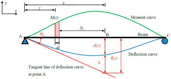 The moment-area method [23] is commonly used to describe the relationship between the moment and deflection of structures. The moment and deflection curves of a simply supported beam subjected to an external load are illustrated in Figure 1. The span of the beam is denoted as L. Take point A as the reference point; tangent deflection ∆ is the distance between the deflection curve at point B and the tangent line of deflection curve at point A (shown in Figure 1). According to the principle of the moment-area method, ∆ can be expressed as:
