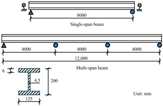 Numerical simulations were conducted to validate the applicability of the method and discuss sensor optimization for the deflection calculation. Both single-span and three-span H-section steel beams were designed for finite-element analysis. The total length for the single-span and continuous beams was 8 m and 12 m, respectively. The supports of the single-span beams were divided into two types: simply supported and clamped-clamped. The material properties of these beams were as follows: elastic modulus E = 2.0 × 1011 N/m2; linear mass density ρ = 7.8 × 103 kg/m3. More details about the models are illustrated in Figure 3.