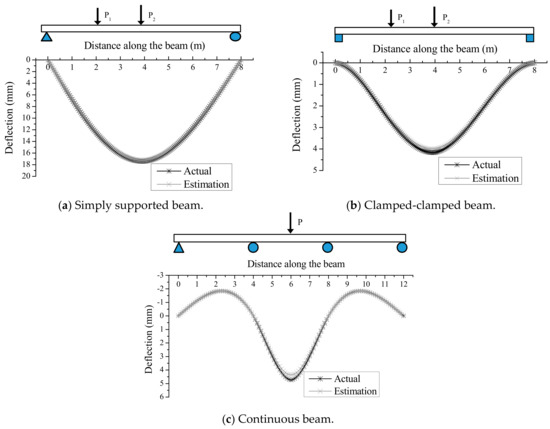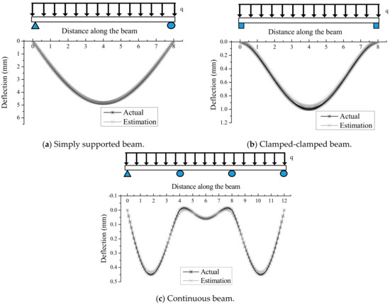 According to the simulation, the presented method is applicable to diverse forms of beams and different types of static loads. Generally, the relative error between the actual and predicted deflection for simply supported beams is less than those of clamped-clamped and continuous beams. This could be a result of the actual strain distribution having been substituted by average strain distribution in the method, and the relative error between the actual and average strain near the support is relatively larger for clamped-clamped and continuous beams subjected to the hogging moment. However, the relative error can be reduced by decreasing the gauge length of sensors near supports according to actual precision requirements.
