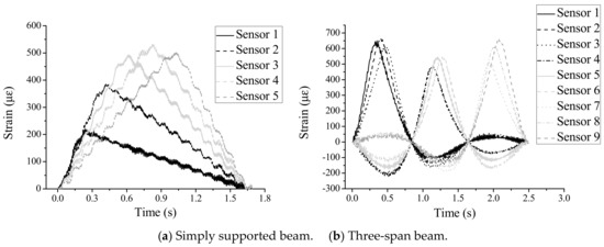 Long-gauge fiber Bragg grating (LG-FBG) sensors can measure average strain over a certain length, and possess both static and dynamic measurement capacity [24]. It is assumed that a number of m long-gauge strain sensors (LGSSs) are installed on the structure. The average strain obtained by ith LGSS with the gauge length Li is denoted as (Figure 2a).