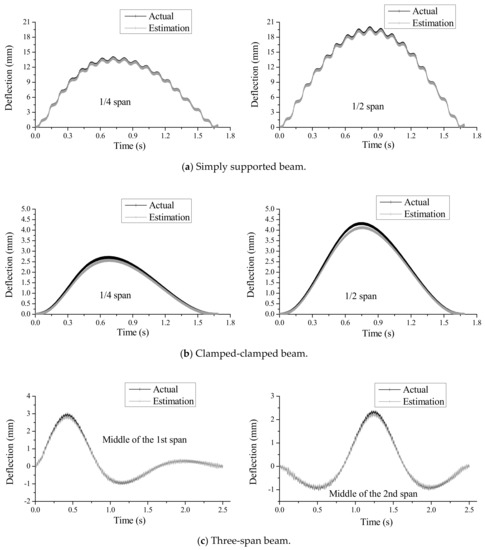 The applicability of the method under dynamic loads is verified based on transient analysis. During the process of a vehicle passing through the structure, the maximum relative error of deflection estimation of the simply supported beam is less than 1% and 2% at mid-span and 1/4 span, respectively. At time t = 0.65 s, the relative errors of deflection at mid-span and 1/4 span are 5.03% and 5.40% for the clamped–clamped beam, respectively. For the continuous beam, the relative error of deflection at the middle of the first span is 4.80% at time t = 0.47 s, while the error is 5.21% at the middle of the second span at time t = 1.28 s.