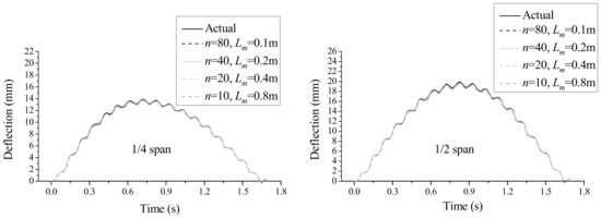 Higher calculation accuracy will be obtained when more sensors (or smaller sensor length) are set due to the fact that average strain from LGSSs is closer to actual strain if sensor length is relatively smaller. Based on the analysis, the relative errors of deflection at mid-span at time t = 0.814 s are 0.93%, 0.98%, 1.16% and 1.89% for samples (1) to (4), respectively. Obviously, this shows that the shorter the gauge length is, the higher the estimation accuracy is. Sensors can be optimized according to the balance between economic cost and accuracy requirements.