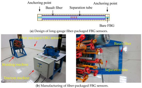 Basalt fiber-packaged FBG sensors are utilized in the experiment. The design and manufacturing of fiber-packaged FBG sensors are demonstrated in Figure 10. A single packaged sensor is mainly composed of two parts: sensing section and anchoring points. The plastic separation tube outside the bare FBG makes sure the average strain between two anchoring points can be measured, and the length of the separation tube indicates the sensing length. In addition, basalt fibers outside the separation tube can guarantee the durability of sensors. It is noteworthy that basalt fibers should be reinforced with epoxy resin to produce a certain degree of stiffness, and pre-strain of the bare FBG can be transferred by this reinforced tube for the measurement of compressive strain. Detailed sensing properties about this kind of sensor can be found in [26].