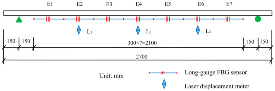 A simply supported steel beam was employed to validate the effectiveness of the improved moment-area method. The elastic modulus and density of the steel were E = 200 GPa and ρ = 7800 kg/m3, respectively. The cross section parameters of the specimen were: width of 100 mm and height of 12 mm. The overall length and net span of the simply supported beam were 2700 mm and 2400 mm, respectively. Seven basalt fiber-packaged FBG sensors (namely E1 to E7) were arranged on the bottom side of the test beam, of which the gauge length was 30 cm. The center of the first sensor (E1) was 30 cm from the left support. Three laser-displacement meters (namely L1 to L3) were also deployed for comparison. L1 and L3 were installed at 1/4 and 3/4 span of the test beam, respectively. L2 was arranged at mid-span of the test specimen. Detailed information about the test beam is provided in Figure 11.