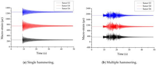 The loading types in this experiment include hammer excitation and vibration under sudden release of initial displacement. The typical strain time-history curves under the condition of single hammering and multiple hammering are shown in Figure 13. The deflection time-history at any position of the beams can be obtained using the aforementioned moment-area method. Furthermore, the deflection distribution along the beams at a certain time can also be achieved.