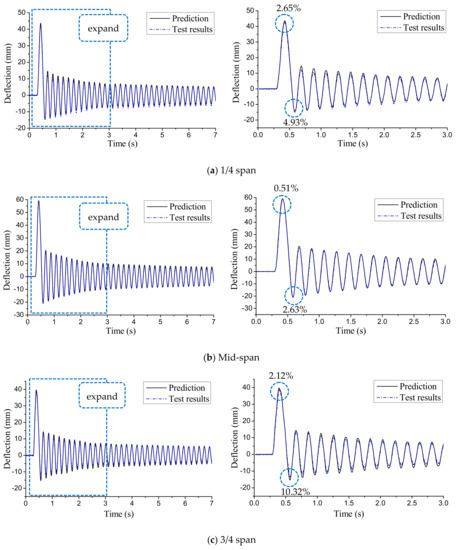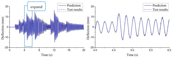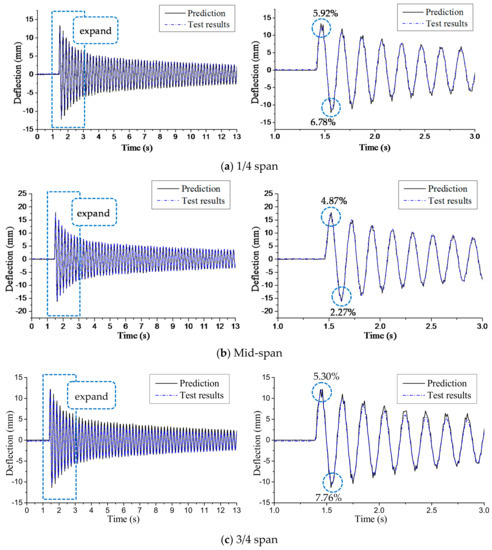 The sampling frequency of FBG-based LGSSs (interrogator of SM130 from Micron Optics) and laser displacement meters is 100 Hz. Strain responses from each FBG sensor and displacement responses from each meter were simultaneously acquired. Taking 1/4 span, mid-span and 3/4 span of the beam as examples, deflection comparisons between the estimated results (Equation (7)) and directly measured results by laser displacement meters are shown in Figure 14. These figures show the time-varying deflection from t = 0 s to t = 13 s as well as the expanded one from t = 1 s to t = 3 s. From these expanded figures, it was found that the trend of the calculated deflection changing versus time was the same as the directly measured one. The errors between the calculated and measured deflection at the first peak (positive) and second peak (negative) were about 5.92% and 6.78% for 1/4 span of the beam. At mid-span, the errors between the calculated and the measured deflection were about 4.87% and 2.27% for the first and second peaks. At 3/4 span, the errors between the calculated and the measured deflection were about 5.30% and 7.76% for the first and second peaks. Generally, the relative errors of peak values can be controlled within about 10%. It is worth noting that “prediction” in Figure 14 means the results estimated using strain response, and “test results” means the results directly measured by laser displacement meters.