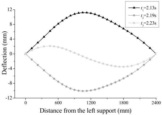 The deflection distribution along the length of the beam at a certain time can also be calculated using Equation (7). Typical calculated deflection shapes of the beam at different times are demonstrated in Figure 15.