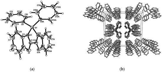4: To a 25 mL flask was added 5 mL Et2O, magnesium shavings (72 mg, 3 mmol), bromobenzene (324 μL, 3 mmol), iodine and the mixture was stirred at 40 °C for 2 h. The gray suspension was slowly transferred into a THF solution of 3 at −78 °C. The brown mixture was gradually warmed to room temperature, and stirred overnight. The solvent was removed, and the residue was purified by column chromatography on silica (hexane/DCM = 5/1) and recrystallized from hexane and DCM to afford white crystals (165 mg, 0.4 mmol, 40% yield). 1H NMR (300 MHz, CDCl3): δ = 7.28–7.44 (m, 10H), 7.60–7.68 (m, 4H), 7.76–7.77 (m, 4H); 13C NMR (75 MHz, CDCl3): δ = 112.3 (CH), 115.3 (Cquat), 121.7 (CH), 124.2 (CH), 124.4 (CH), 128.5 (CH), 130.5 (Cquat), 130.7 (CH), 130.8 (Cquat), 135.3 (CH), 158.7 (Cquat), 159.9 (Cquat). 29Si NMR (80 MHz, CDCl3): δ = −21.6 (s). HRMS Calcd for C28H18O2Si(M+): 414.1076; Found: 414.1074. Anal. Calcd. for C28H18O2Si (C, 81.13, H, 4.38); Found: C, 81.49, H, 4.17.