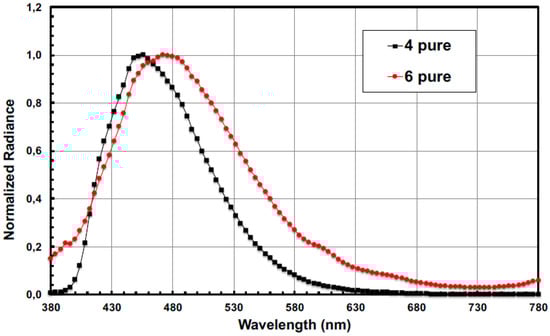 Taking in account the thermal stabilities and the physical properties of compounds 2, 4–6, only compounds 4 and 6 were used as emitting material (EM) pure or doped in mCP matrix. In a first attempt, compound 4 (device A) and 6 (device D) were used as pure emitter in the device. The electroluminescence (EL) spectra are shown in Figure 4. The blue EL emission is red-shifted relative to the emission observed in diluted solution (Table 1). The red-shift is larger for compound 6 (29 nm) comparatively to compound 4 (15 nm). In these devices, luminance and external quantum efficiency (EQE) [45] are moderate (Table 2). However, the EL performance is larger for compound 4 relative to device 6. It is believed that charge transport in 6 is low, causing this low efficiency. An increase of the performance could be observed when the compounds are used as dopant in a mCP matrix (Table 2 and Figure S2). For compound 4, no modification of the CIE coordinates was observed when the doping ratio increases until 4.5% and an external quantum efficiency (EQE) of 2.5% and a maximum brightness of 1580 cd/m2 can be reached. A maximum current efficiency (CE) and power efficiency (PE) of 2.8 cd/A and 1.4 Lm/W respectively are therefore obtained. Such values are quite good for the deep blue fluorescent OLED devices obtained with compound 4. When compound 6 is used as dopant in the mCP matrix, a blue-shift of the EL spectrum is obtained relative to the pure material. However, a decrease of electroluminescent performance is observed compared to those of compound 4. For compound 6, the best performance can be achieved when it is used as dopant in the mCP matrix indicating that the presence of the fluorenyl group on the Si atom doesn’t favor the charge mobility in the emissive layer. This assumption is supported by the fact that the gradual increase of the doping ratio (Table 2) leads to accumulation of charges, a red-shift of the emission properties and a decrease of the performance.