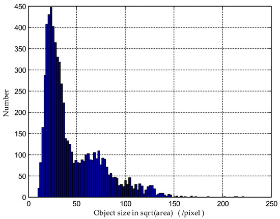 It can be found from Figure 1 that the areas of most bounding boxes are between 102 and 1002 pixels in our dataset. In the original paper, their anchor-based method is built on a pyramid of anchors with multiple scales and aspect ratio. The three aspect ratios used are 0.5, 1, 2, and the areas of the square shape bounding boxes at the three scales are 1282, 2562, and 5122 pixels, respectively. However, the default setting of the anchor parameters, which is not able to cover the range of small object size in optical remote sensing images, enable to deliver good results on datasets such as PASCAL VOC where the objects are typically relatively large. In order to address this problem, several modifications are described as below.