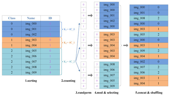 Fortunately, in total we collected 5922 optical remote sensing images, 5216 for ‘ship’ and 706 for ‘plane’. Obviously, the numbers of images in different classes are imbalanced, which pose great challenges for training. To address this, we apply a sampling strategy named ‘balanced sampling’ (BS) [30] during training. This strategy is aim at iterating as uniform as possible within an epoch with respect to classes. In reality, we use one type of list, namely a training list. A typical example for three classes is shown in the Figure 4. Firstly, we sort our training list class by class and count the largest category number denoted as in the Figure 4. Then we generate a random list of integers with the interval for each class. For each class, we leverage the mod operator to obtain a corresponding indexed-value list which the images are sampled according to. Finally, a new training list is generated by concatenating and shuffling the sampled image list. After an epoch, the foregoing operators are repeated again until the end of the whole model training. Apparently, our sampling strategy is not only cost effective but very easy to implement.
