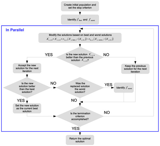 In Lines 20–24 of Algorithm 2, a new member is computed using the Jaya algorithm, i.e., using Equation (1). It should be noted that this computing uses both the current best and worst solution. In Equation (1), iterators j, k and i refer respectively to the design variable of the function, the member of the population, and the current iteration, while and are random numbers uniformly distributed.