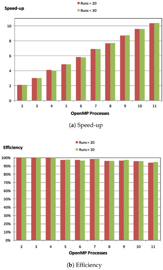 We will now analyze the parallel behavior of the parallel algorithm described in Algorithm 4, i.e., the shared memory parallel algorithm. Figure 2 shows results setting the “Iterations” parameter equal to 30,000 and using populations of 512 members. We observe that parallel efficiency being equal to, respectively, and when 2 and 11 processes are used, regardless of the value of “Runs.” We can conclude that, based on results presented in Figure 2, and applying the Rosenbrock function, for a population size equal to 512, the scalability is almost ideal.