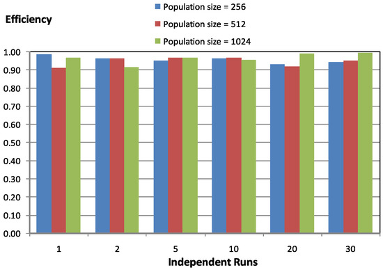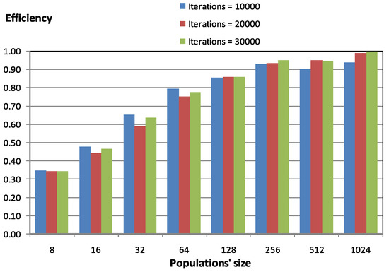 With respect to Algorithm 4, the computational load of one execution of the “Update Population” function might not be significant, depending on the computational cost of the function evaluation (Line 16), which obviously depends on the particular function to be optimized. For example, in Equation (2), the number of floating point operations is 7 for each iteration of the sum, so only 239 floating point operations have to be performed in each evaluation. Therefore, it is important to reduce both “flush” processes and “critical” sections, and it should be noted that we have developed the parallel algorithm avoiding synchronization points. Reducing both the “flush” procedures and the critical sections besides the automatic load balancing allows one to obtain good results both in efficiency and scalability. It is worth noting that, due to the large number of iterations performed, any poorly designed or implemented detail in the parallel proposal can significantly worsenboth the parallel performance and scalability.