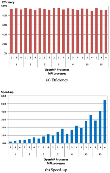 The hybrid parallel algorithm developed combines the shared memory parallel algorithm analyzed and a high-level parallel algorithm based on the distribution, among nodes (multiprocessors), of the computing load associated with the independent executions that will be carried out. The latter, described in Algorithm 5, has been developed with MPI, the former with OpenMP. However, in order to efficiently use all processing units of the parallel platform we mapped, where possible, more than one MPI process was employed into one computing node. Figure 5 shows the efficiency and speed-up for the hybrid parallel Jaya algorithm, executed in the heterogeneous memory platform previously described. It can be seen that the proposed hybrid parallel algorithm offers good scalability. It should be noted that we obtained a speed-up up to using 60 processors of the heterogeneous memory platform. It is worth noting that the hybrid parallel algorithm exploits two levels of parallelism, and at both levels it includes load balancing mechanisms.