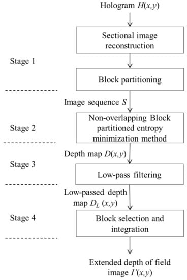 The objective of our proposed method is to obtain an extended field of depth (EFD) image (i.e., an image with all the object points in focused, disregard of their geometry and distance from hologram ). The process can be divided into 4 stages as shown in Figure 2, and outlined as follows. In stage 1, the hologram is back-propagated to a stack of regular spaced reconstruction planes along the axial direction, a process that is referred to as “sectional reconstruction”. The image on each reconstruction plane is evenly partitioned into non-overlapping square blocks. In stage 2, the entropies of the image blocks in all the reconstruction planes are evaluated. The depth of each block is taken to be the distance of the reconstruction plane that exhibits the minimum entropy for that particular block position. It can be envisaged that the integration of the depth of all the constituting blocks (each contributed by one of the reconstructed images) will form a blocky depth map. Next, in stage 3, low-pass filtering is applied to smoothen the depth map. Finally, in stage 4, an extended depth of field image of the object scene is obtained by selecting each pixel from the reconstruction image plane that corresponding to the depth of the pixel in the depth map. Details of each stage are described as follows.