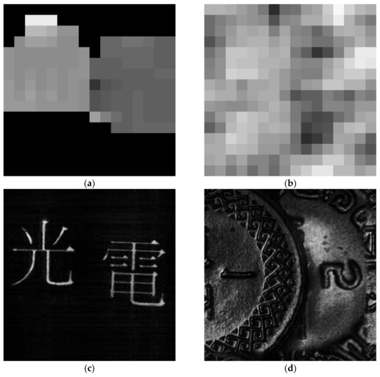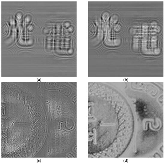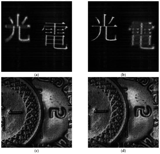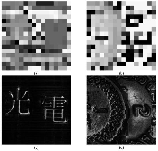 To evaluate the performance of our proposed method, 2 sets of holograms have been captured with the OSH system that has been configured to operate in the incoherent mode [22], and with the wavelength of the laser beam being 633 nm. The first hologram “A” is a pair of binary Chinese characters “光” and “電”, and second hologram “B” is a grey level image of a pair of partially overlapping coins. The pixel size of holograms (i.e., the sampling interval with which each hologram pixel is recorded) “A” and “B” are 5 μm and 15 μm, respectively. In both cases, the range of distance between the object space and the hologram plane is [0.015 m, 0.03 m], but there is no prior knowledge on the depth of individual objects in the scene. The sine and the cosine holograms of the 2 samples are shown in Figure 4a–d.