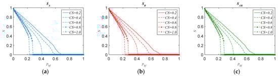 This subsection is introduced to investigate the effect of CS on the robustness of no-feedback interdependent networks. We started the simulation from a special case where different subnetworks had equal coupling strength, i.e., CSA = CSB = CS. Based on the node number and average degree set given above, the cascading failure of interdependent networks was simulated as follows. At the beginning, according to different failure modes, we randomly select nodes with a ratio of p as failure nodes in only one subnetwork or the whole interdependent networks, then the initial failures cause the cascading failure. When the cascading failure ends, the results of SA, SB, and SAB with different coupling strength under two failure modes are demonstrated in Figure 2 and Figure 3, respectively. It should be noted that SAB = (SA + SB)/2 is shown since different subnetworks have the same number of nodes.